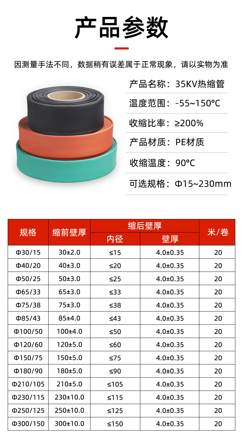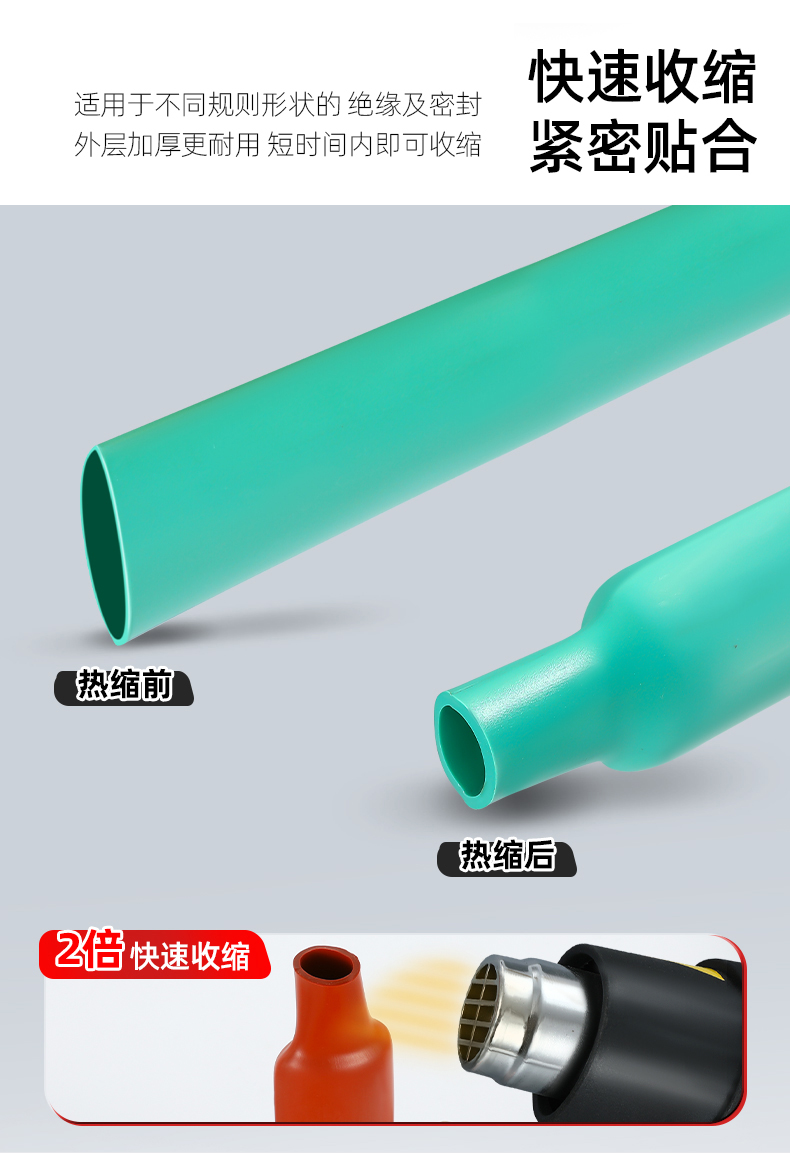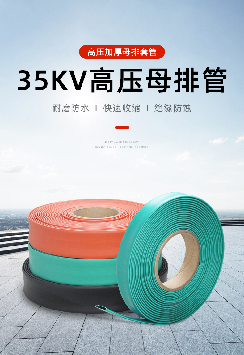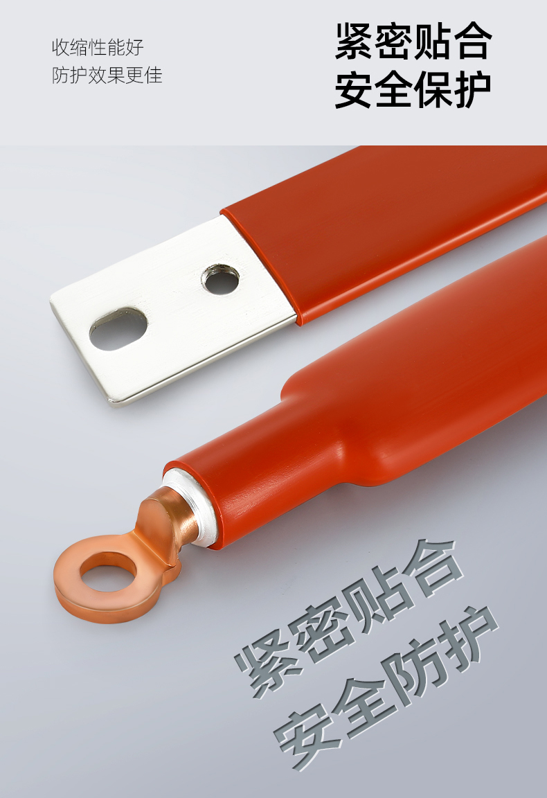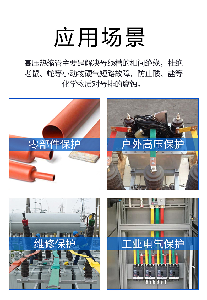 热缩绝缘套管采用特殊聚烯烃经过特殊加工而 成,具有极高的绝缘性能。热缩绝缘套管分为 1KV 低压,10KV 高压和 35KV 高压,热缩绝缘 套管用于变电站母线,高,低压开关柜母线的 绝缘防护,可以使开关柜的结构紧凑化 (相间距离缩短), 防止偶发性的短路事故。